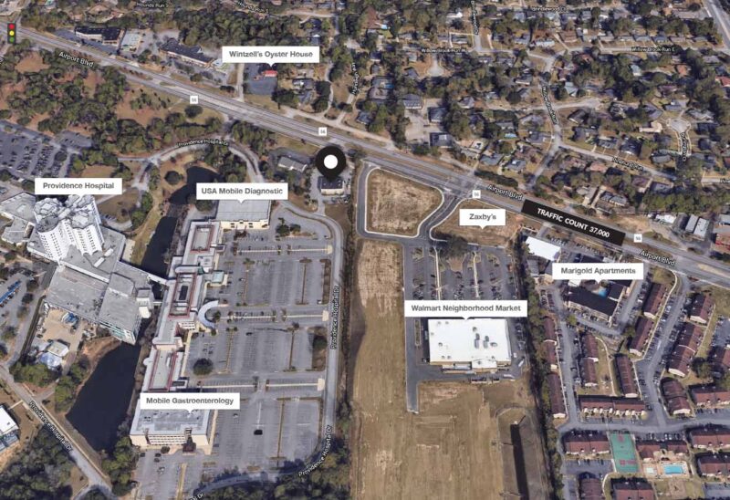 The property is anchored by Providence Hospital and Walmart Neighborhood Market. 1,500± SF available with a floorplan that includes waiting room, receptionist desk, two large offices, large exam room, lab, break area, and bathroom. Ideal for retail, medical, or office uses. Pylon sign panel available. Property has full access to East and West bound traffic as well as Providence Hospital Drive. Average daily traffic on Airport Blvd totals 37,000± vehicles per day..